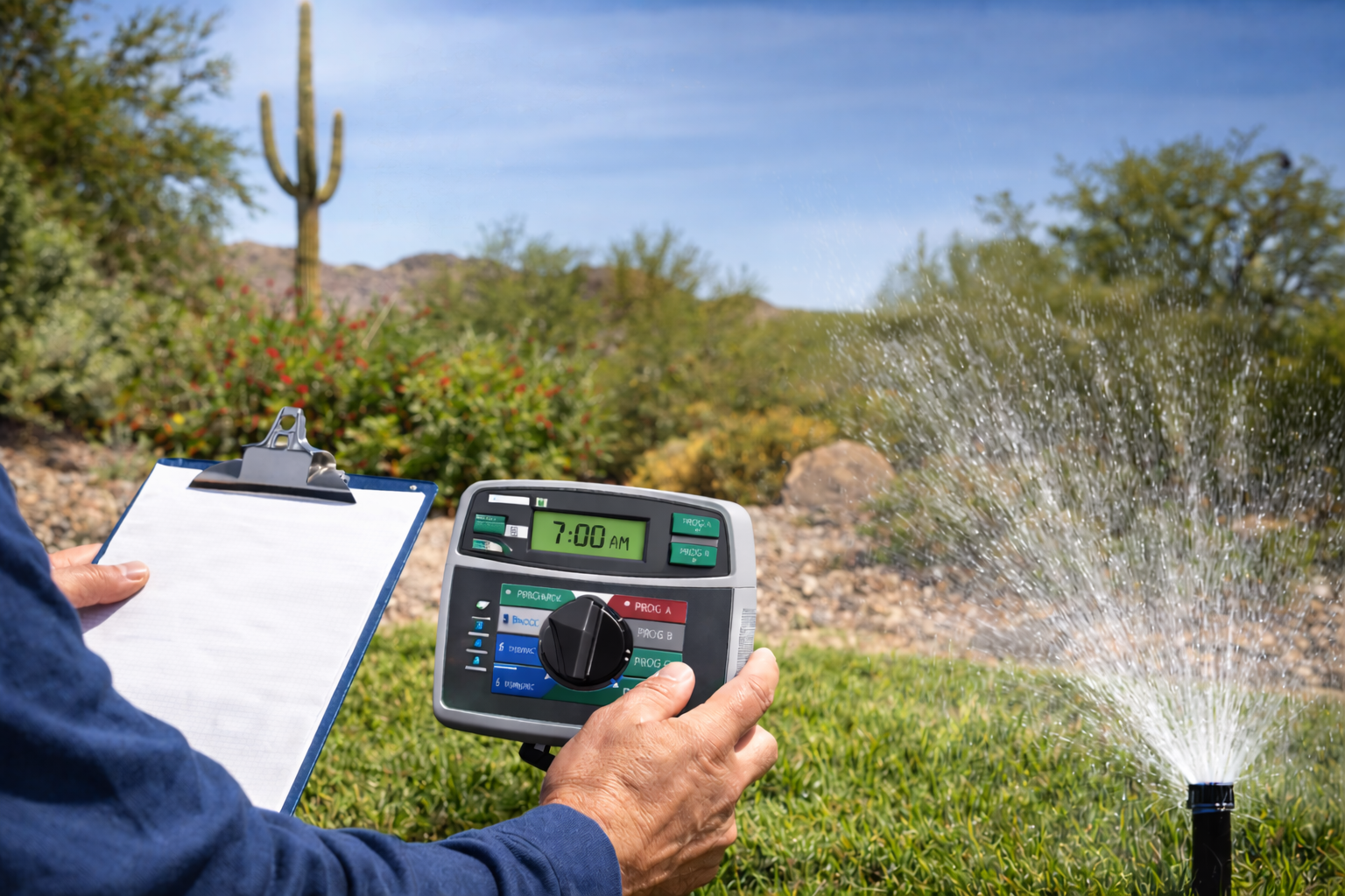 In a desert climate, proper irrigation means watering deep, adjusting seasonally, and programming each zone according to plant type — whether it’s trees, shrubs, citrus, turf, vines, or cactus.